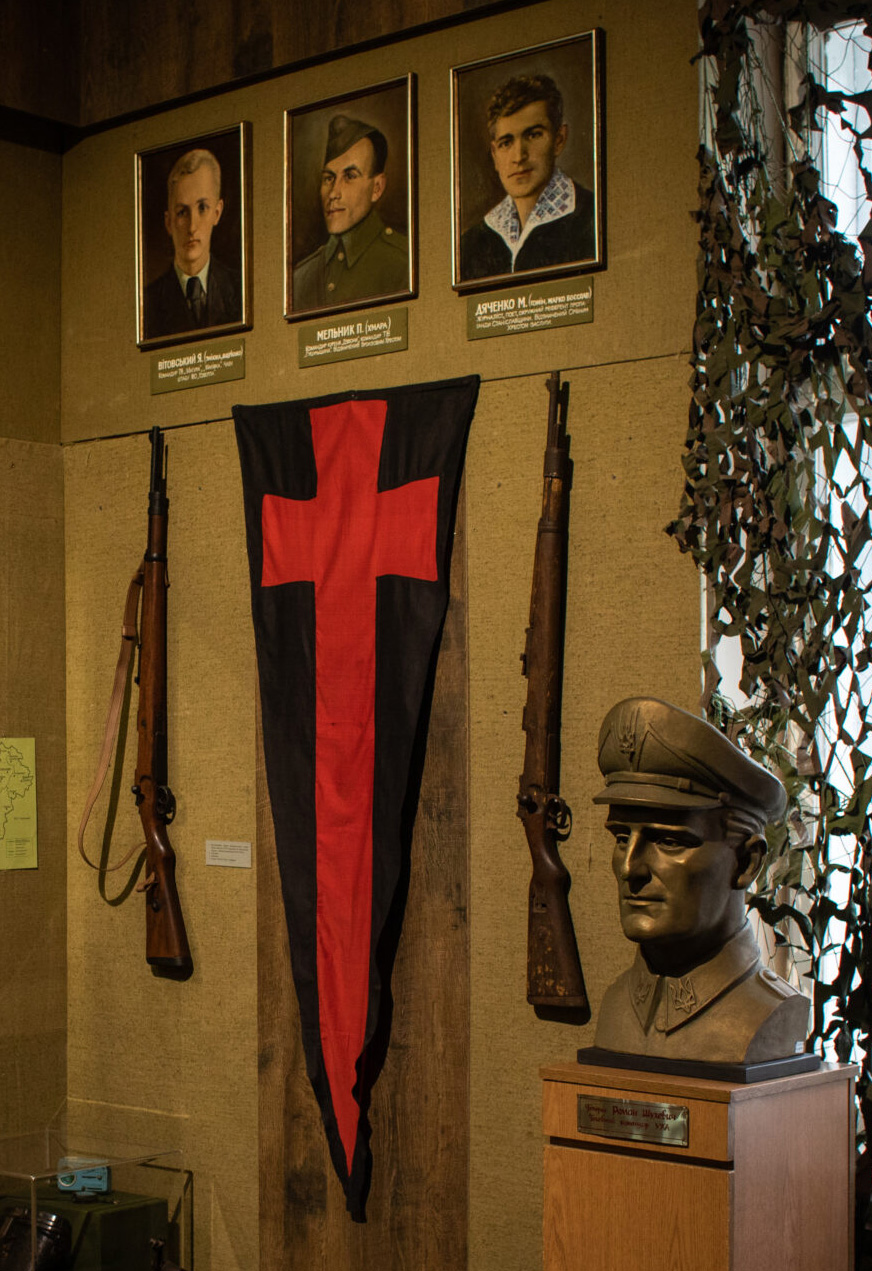 Бандерівці як правило використовували червоно-чорні знамена – кольору «крові та землі» – з обрисом хрестомеча.